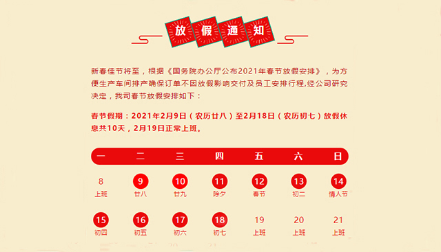 春節的腳步臨近,根據《國務院辦公廳公布2021年春節放假安排》,結合我司的具體狀況,方便生產車間排產確保訂單不因放假影響交付,經公司研究決定,我司春節放假安排如下: